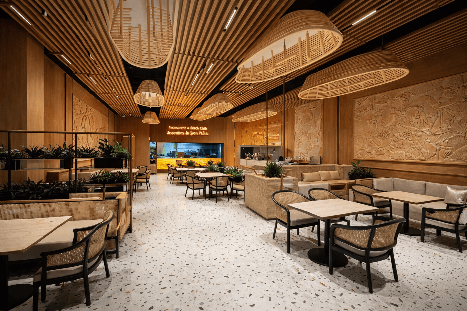 The concept focused on a warm, contemporary dining experience, using wood textures, sculptural ceiling elements, and soft lighting to create a distinctive restaurant identity.