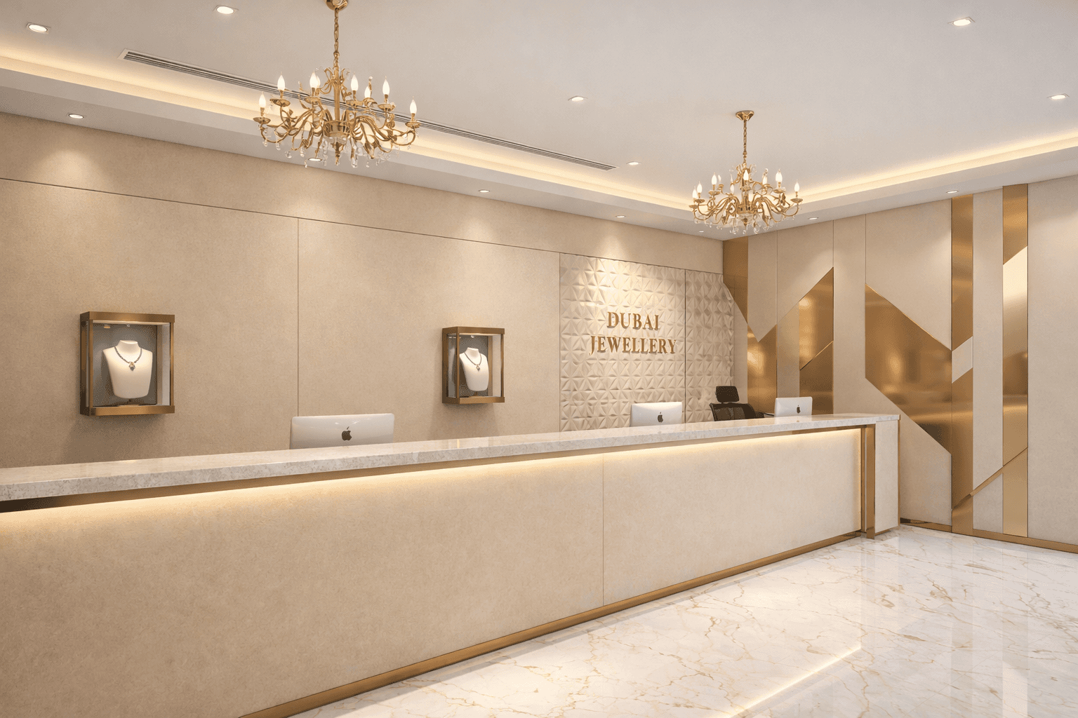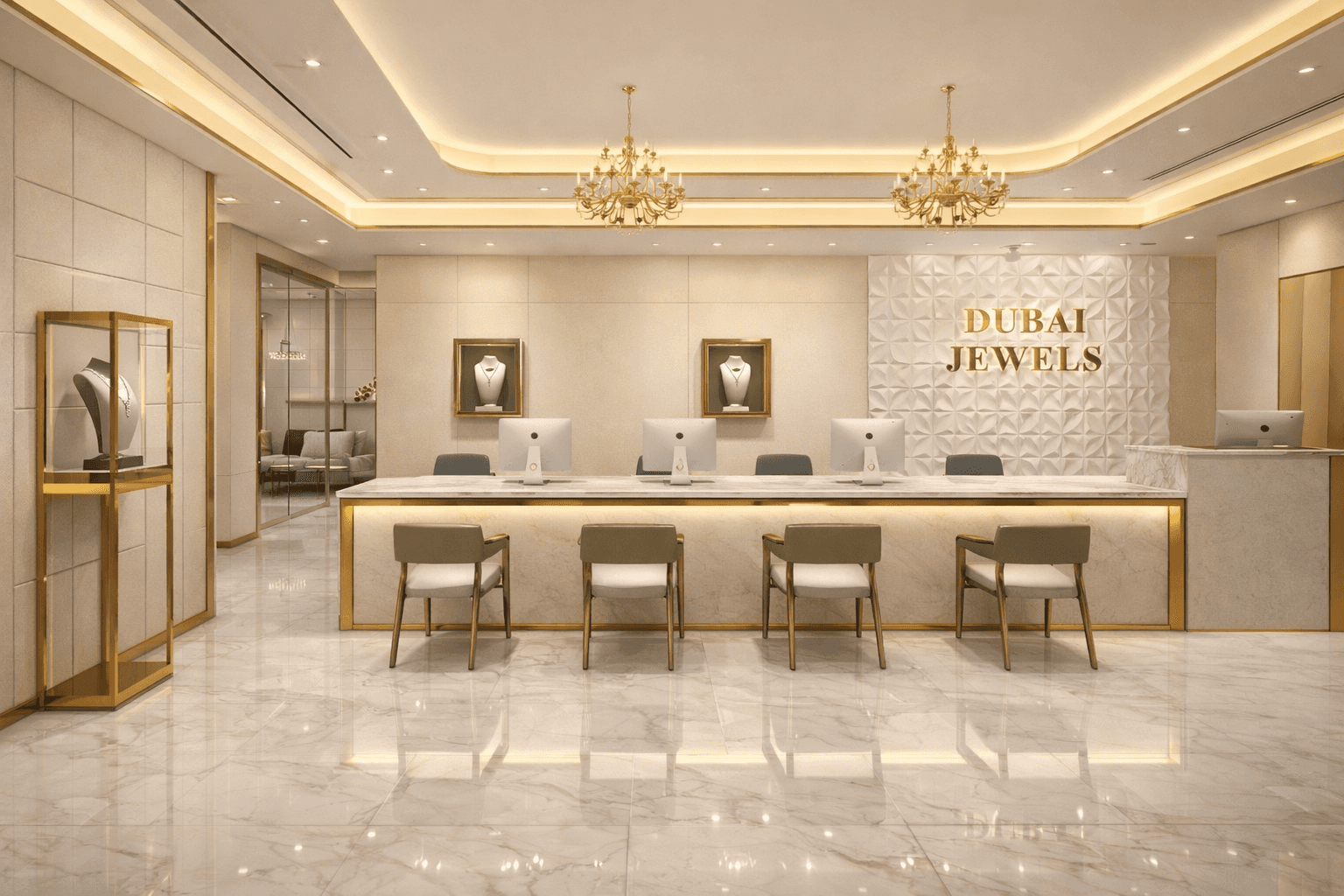 The design concept focused on a luxury retail ambience, combining marble finishes, gold accents, and soft lighting to create a refined jewelry shopping experience.
