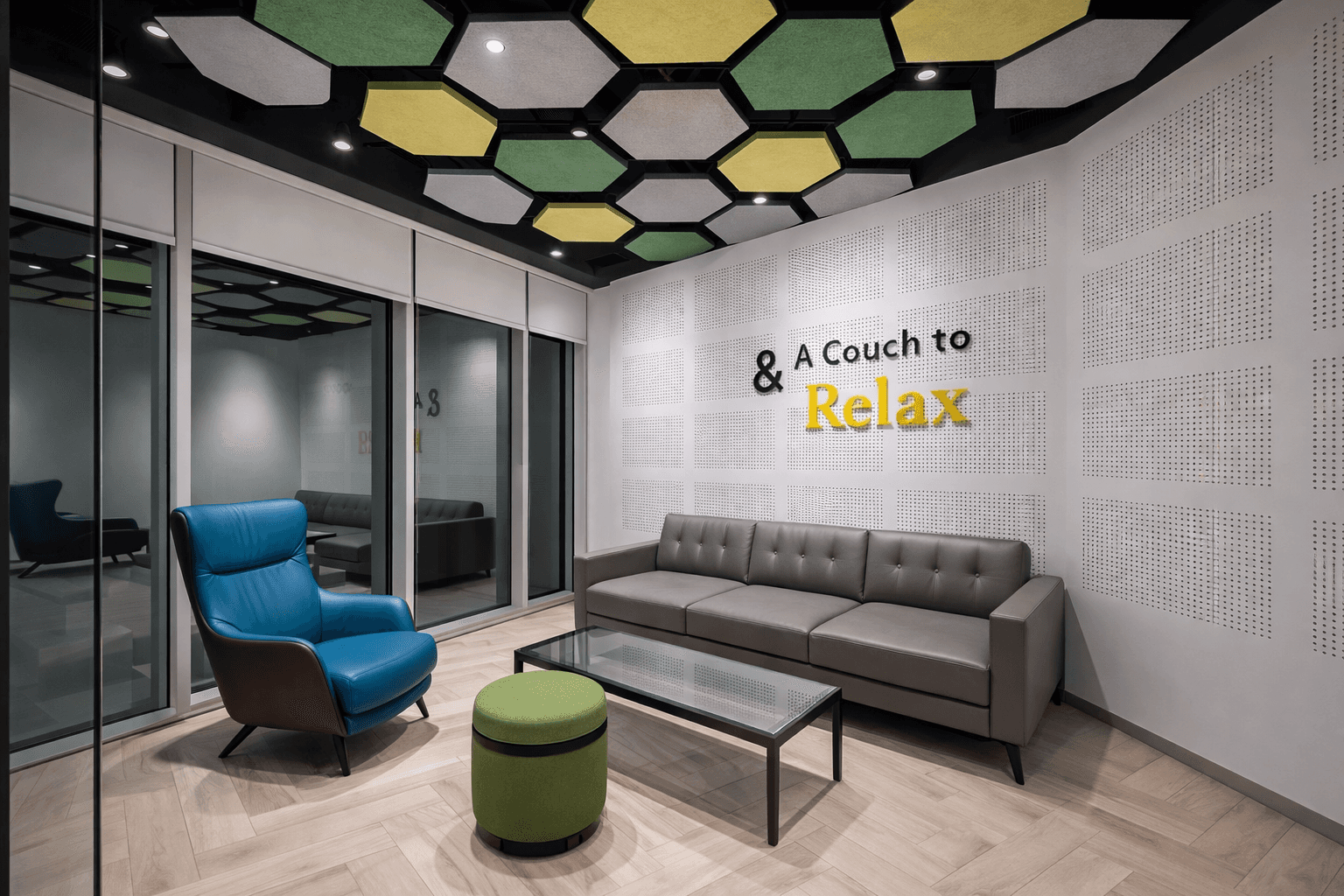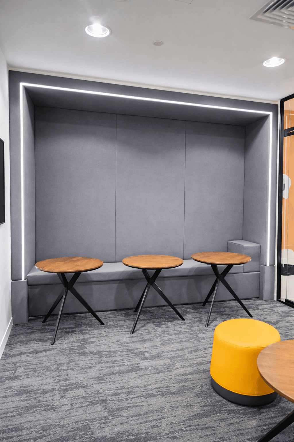 Seating and circulation were arranged to support informal meetings, short breaks, and flexible use within a compact footprint.