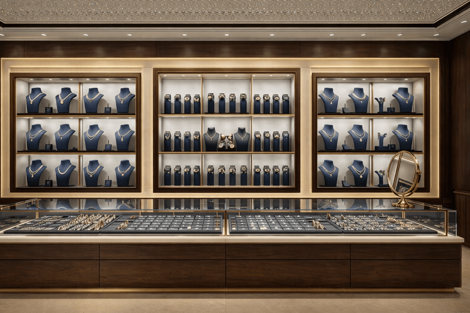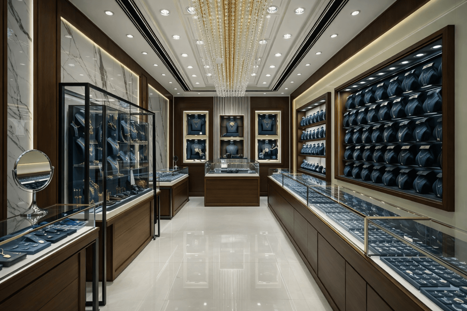 The design concept focused on a luxury retail atmosphere, using refined materials, warm lighting, and symmetrical displays to highlight jewelry collections.